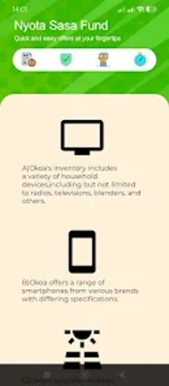 Nyota Sasa Fund, Android platformunda sunulan bir verimlilik uygulamasıdır. Kullanıcıların ürünleri 'Şimdi Al, Sonra Öde' modeliyle satın almalarına olanak tanır. Bu uygulama, alışveriş deneyimini daha esnek hale getirirken, kullanıcıların bütçelerini yönetmelerine yardımcı olmayı amaçlamaktadır. Ürün satın alım süreçlerini basitleştirerek, kullanıcılara finansal özgürlük sunar.